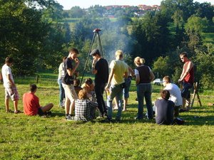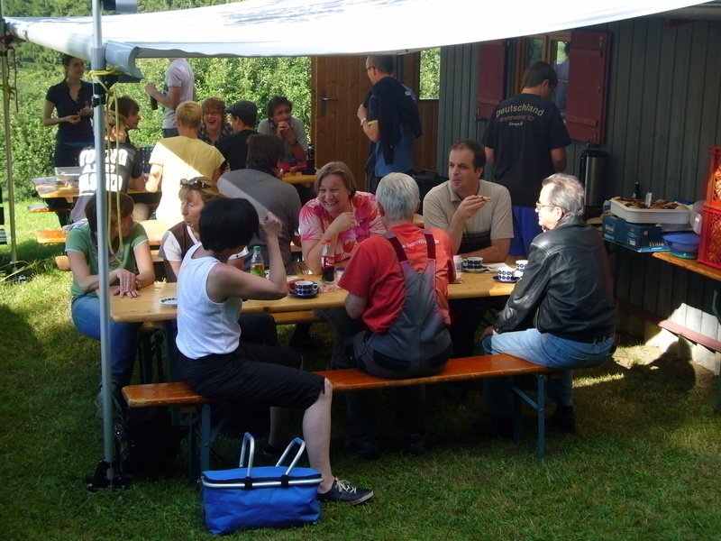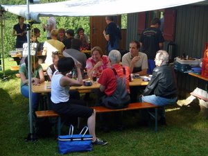 Dort, direkt neben dem Waldlehrpfad, hat Gerhard seine Wiesen mit Wald und Gartenhäuschen samt Markise und Geräteschuppen zu einem wahren Freizeit,-Vergnügungs- und Erlebnispark ausgebaut. So haben seine Gäste Jahr für Jahr im August eine riesige Auswahl an sportlichen Aktivitäten : Tischtennis, Volleyball, Bogenschießen, Kleinfeld-Fußball, Holz sägen und vieles mehr.