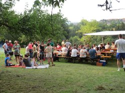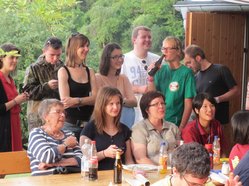 Noch näher kam man sich, als gegen 20 Uhr starker Regen einsetzte und die Gäste unter die Markise flüchteten. Der guten Laune tat dies keinen Abbruch. Im Gegenteil : schon am ersten Abeend des Austauschs zeigte sich, dass die japanischen Gäste ihren deutschen Gastgebern mit erfrischender Offenheit und Herzlichkeit gegenüber traten.Zahlreiche Schnappschüsse wurden gemacht und wieder einmal endete auch dieses Gartenfest "im Zeichen des Lächelns" zu später Stunde am Lagerfeuer.