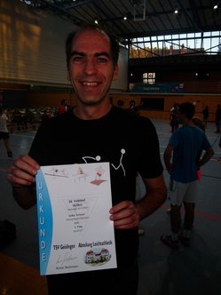 Doch schon der Auftakt war denkbar unglücklich. Bereits beim Aufwärmen verletzte sich Andreas am Fuß. Nur dem oben beschriebenen Umstand war es zu verdanken, dass wir zum ersten Spiel vollzählig antreten konnten. Volker Scheuer hatte beim Volkslauf teilgenommen, war danach als Zuschauer zu uns gestoßen und durfte sich sogleich weiterhin körperlich betätigen.