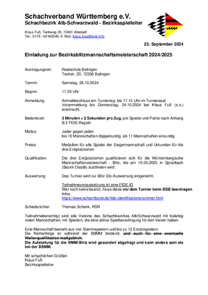 Bezirksblitzmannschaftsmeisterschaft am 26.10.24 in Balingen.