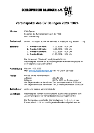 Morgen starten wir ab 19.30 Uhr im Zollernschloss mit der 1.Runde des Vereinsturniers 2023/2024. Für dieses Jahr stehen wieder 9 Runden auf dem…