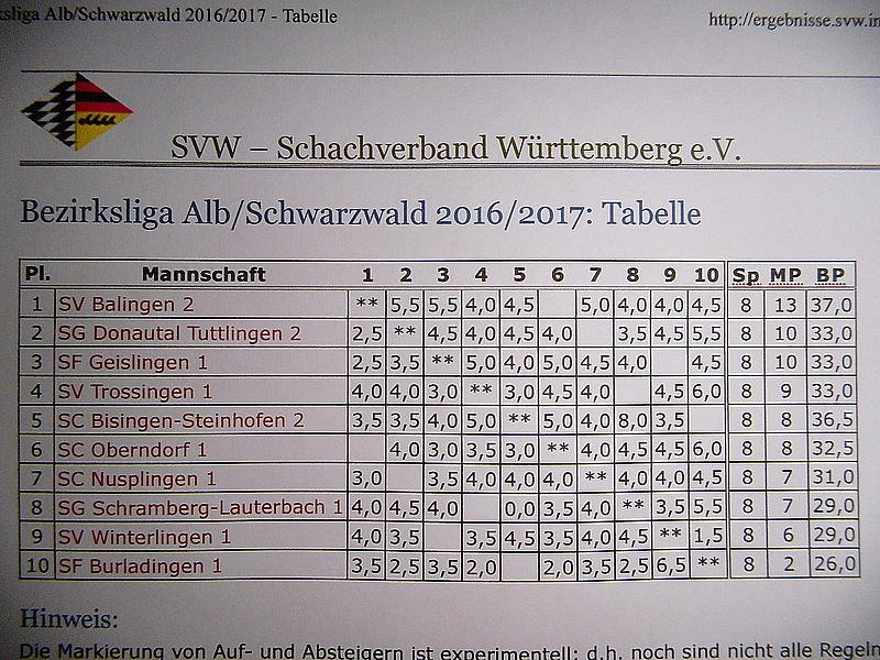 Wir gratulieren unserer 2. Mannschaft zum vorzeitigen Gewinn der Meisterschaft in der Bezirksliga. Gestern Abend gab es am 8. Spieltag einen knappen 4,5:3,5-Auswärtssieg beim Tabellenletzten SF Burladingen. Damit steht Balingen 2 mit 13:3 Punkten an der Spitze und kann von den Verfolgern aus Tuttlingen 2 und Geislingen 1 (jeweils 10:6 Punkte) nicht mehr eingeholt werden.
