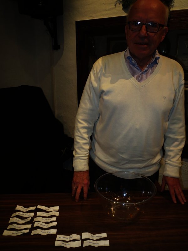Heute Abend gab es im Rahmenprogramm der 2. Runde im Vereinsturnier die Auslosung der beiden Vereinspokal-Turniere. Geburtstagskind André Dreyer war die Glücksfee im B-Pokal und zog mit "Michael Geiger-Andreas von Huene" und "Leopold Stefani-Helmut Stefani" gleich zwei Familienduelle.