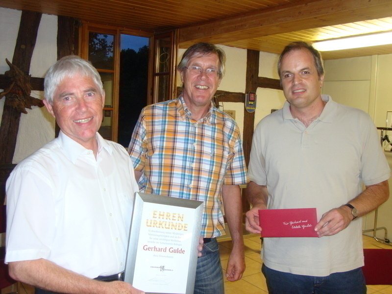 Darüber hinaus wurde unser Neuzugang der ersten Mannschaft Kevin Narr als Vereinsblitzmeister 2012 geehrt : ein gelungener Einstand. Für langjährige Treue erhielten Hans Feist die silberne (20 Jahre) und Stefanie Wielath die goldene (30 Jahre) Ehrennadel. Seit 1972 ist Gerhard Gulde mit unermüdlichem Einsatz eine der großen Stützen des SV Balingen. Völlig zu Recht überreichten ihm Herbert Reuß und Andreas von Huene heute Abend eine Urkunde für 40-jährige Mitgliedschaft im SVB und ein kleines Geschenk.