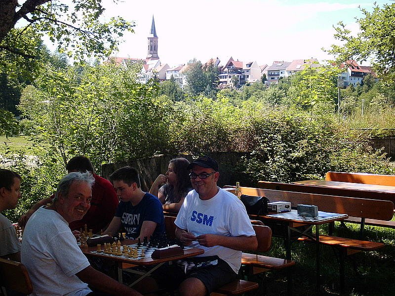 ....ja, wer den Schaden hat. Die Spuren seines Fahrradunfalls vom vergangenen Montag waren Karl-Heinz Müller beim gestrigen Promenadenblitzturnier des SV Schömberg noch anzusehen. Seinem Spiel war allerdings nichts anzumerken. Gewohnt spielstark erreichte er im Feld der elf Teilnehmer einen 4. Platz. Zunächst wurde ein volles Rundentiurnier durchgeführt. Die ersten Sechs nahmen dann die erspielten Punkte in eine Endrunde mit.