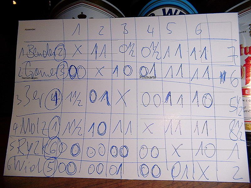 Gut also, dass Turnierleiter Sebastian During das Turnier nicht abgesagt hatte. Er selbst konnte nämlich nicht da sein. Die Leitung übernahm André Dreyer. Gespielt wurde doppelrundig. Nach zehn Runden lag Mike Molz mit 8,5 Punkten vor Klaus Bender, Thomas Gomer, André Dreyer, Dieter Widmann und Viktor Ryzkov.