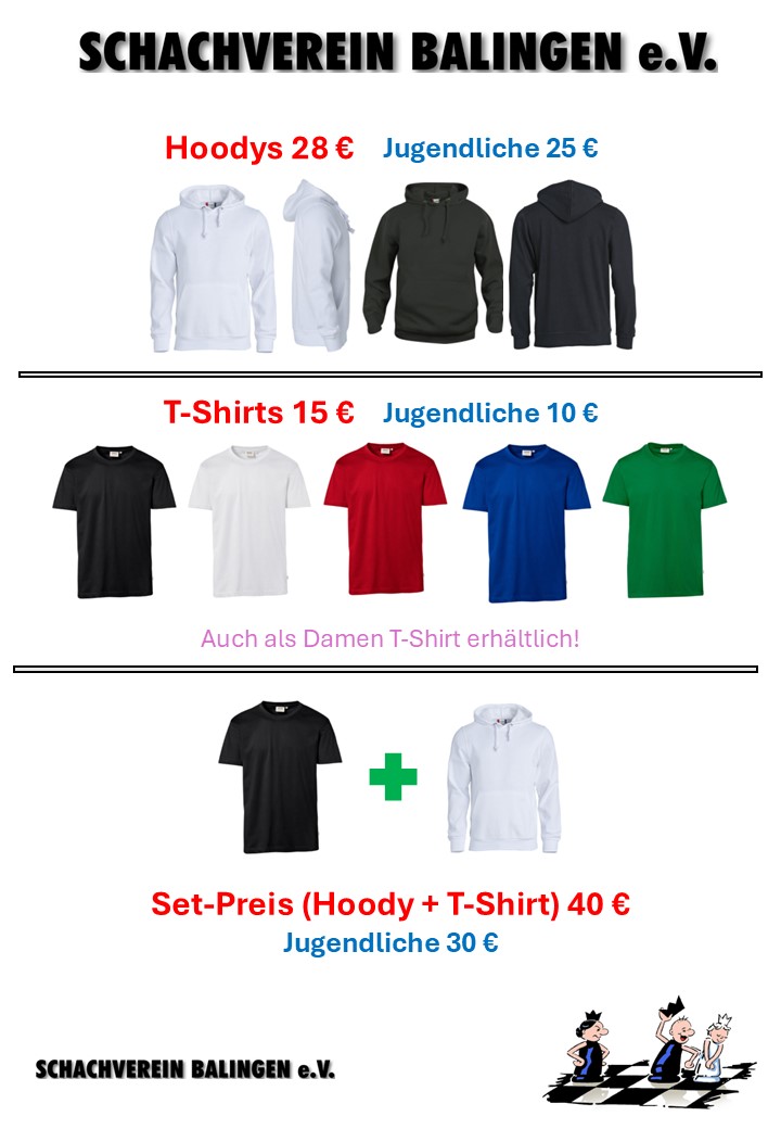 Ihr habt Interesse an Schach-T-Shirts und Hoodys? Dann habt ihr ab jetzt die Möglichkeit euch T-Shirts und Hoodys vorzubestellen. Bestellungen werden bis Ende September entgegengenommen. Danach erfolgt die Bestellung.