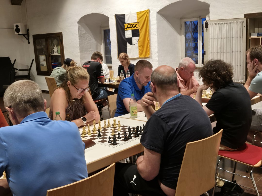 Dass die Schnellschachturniere in Balingen immer beliebter werden, kann man gut an den gestiegenen Teilnehmerzahlen ausmachen. Waren es letzte Woche noch 15 Teilnehmer, kamen an diesem Donnerstag sogar 16 Spieler ins Zollernschloss. Zum Vergleich dazu: Beim 1. Turnier der Saison waren es lediglich 7 Teilnehmer. Erwähnenswert ist auch die Teilnahme von Lilli Hahn. Wollte sie eigentlich nur kurz im Schloss vorbeischauen, wurde sie direkt zum Mitspielen animiert. Trotz Einstieg in der 3. Runde reichte es für einen soliden Mittelfeldplatz. Sieger des Abends wurde Kevin Narr, gefolgt von Klaus Bender. Damit hat Klaus übernächste Woche die besten Karten in der Hand, um sich in der Gesamtwertung durchzusetzen und den Titel des Vereins-Schnellschachmeisters 2024/2025 einzusacken.