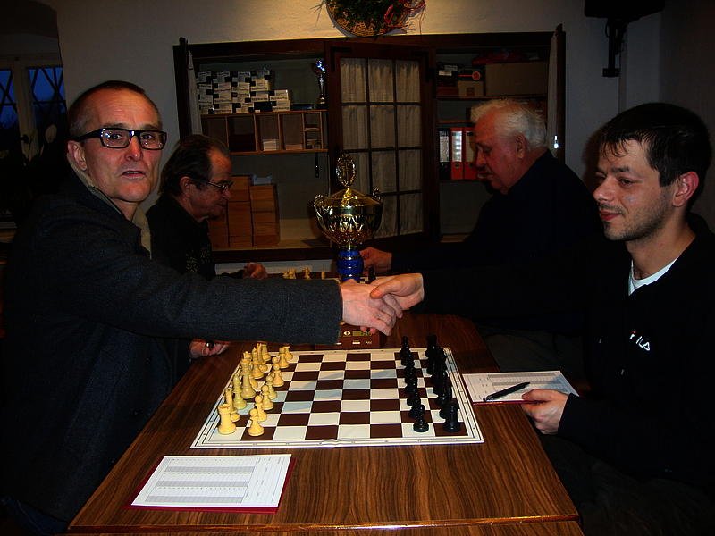 Dass "Turmendspiele immer remis sind", erwies sich gestern Abend aber spätestens dann als unzutreffend, als Thomas' Gegner Helmut Stefani allzu forsch einen Bauern nach vorne schob und unversehens mit einer Schachgabel konfrontiert wurde, die ihn zur sofortigen Aufgabe zwang.