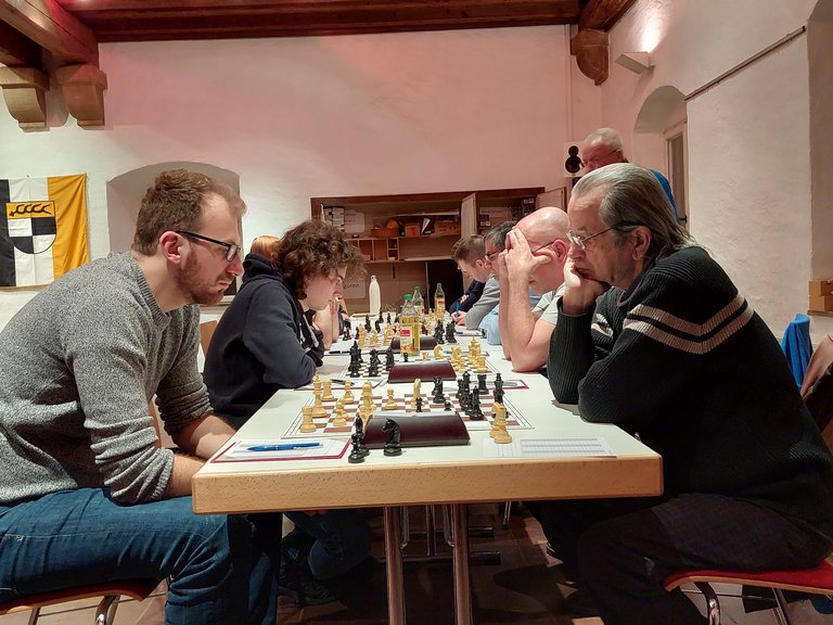 Das Vereinsturnier 2023 biegt bereits in die Schlussrunde. Heute standen acht Paarungen der 5. Stunde auf dem Programm, von denen immerhin fünf gespielt wurden. Die Sieger des Abends heißen Karl-Heinz Müller, Jürgen Muschkowski, Dieter Gomer und Stefan Hess. Ewald Ott und Titian Heckmann trennten sich Remis.