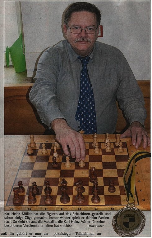 Wettkämpfe trug er zunächst als Mitglied der dritten Mannschaft aus, doch er stieg schnell in die zweite und danach in die erste Mannschaft auf. Ihr gehört er nun ununterbrochen seit 48 Jahren an und hat sich in dieser Zeit unter anderem mit Gegnern in der Verbandsliga gemessen. Nun zieht er die Figuren an Brett acht in der Landesliga. Mit den Senioren fährt er au0erdem nach Tübingen, Reutlingen und in den Stuttgarter Raum, wo ebenfalls starke Gegner auf ihn und seine Mannschaftskollegen warten. Mehrfacher Kreis- und Bezirksmeister sowie Bezirkspokalsieger, Teilnahmen an einem Parallelturnier zur Schacholympiade und an einem internationalen Turnier in Deizisau, amtierender Vereinsmeister – die Liste der Erfolge ist lang. Sie kommen aber nicht von ungefähr, denn Müller analysiert daheim immer wieder gespielte Partien und liest Bücher zum Beispiel über Eröffnungen. Früher war er auch ein begeisterter Hobby-Volleyballer und – Fußballer, viele Jahrzehnte lang aktiv im Geislinger Tennisverein. Aus gesundheitlichen Gründen sind für ihn diese Sprórtarten jedoch tabu, doch Schach spielen kann ich immer, freut sich Müller.
