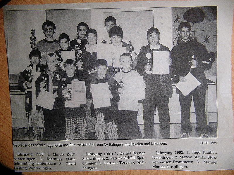 Auf dem Siegerfoto des ersten Grand-Prix-Turniers in Balingen am 22. November 1998 (rechts oben) können Sie sich auf die Suche machen nach einigen Schachgrößen, die bis heute an den Brettern im Schachbezirk anzutreffen sind : Marcel Liebhart und Oliver Jovalekic aus Albstadt, Stephan Wagner aus Frommern, Matthias Narr aus Gosheim, Marco Rutz aus Winterlingen und Ingo Klaiber aus Nusplingen.