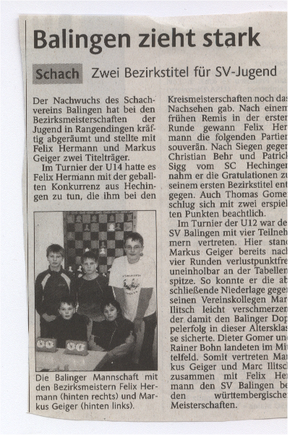 Die Bezirksmeisterschaften im Januar 2008 in Tuttlingen bzw. Horb waren die mit Abstand erfolgreichsten für den SV Balingen in den vergangenen zehn Jahren. Erstmals konnten durch Lilli Hahn (U18 weiblich), Felix Hermann (U14) und Markus Geiger (U12) drei Titel errungen werden. Doch auch Philipp Prinz (U16), der mit einem Freiplatz angereist war, Dieter Gomer (U12) und Michael Geiger (U10) schafften mit ihren zweiten Plätzen den Sprung zur württembergischen Meisterschaften, die in der Woche nach Ostern in der Jugendherberge auf dem Feldberg ausgetragen werden.