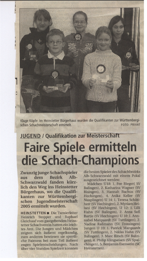 Die anderen Schachkreise (Schwarzwald und Donau/ Neckar) beanspruchen zumeist nicht alle ihnen zustehenden Startplätze, so dass die Aussichten auf Freiplätze für Balinger Spieler, die die Qualifikation bei den Kreismeisterschaften verpasst oder nicht teilgenommen haben, im Allgemeinen recht gut sind. Dies erklärt neben den guten Leistungen unserer Schützlinge die vergleichsweise große Zahl Balinger Teilnehmer bei den Bezirksmeisterschaften.