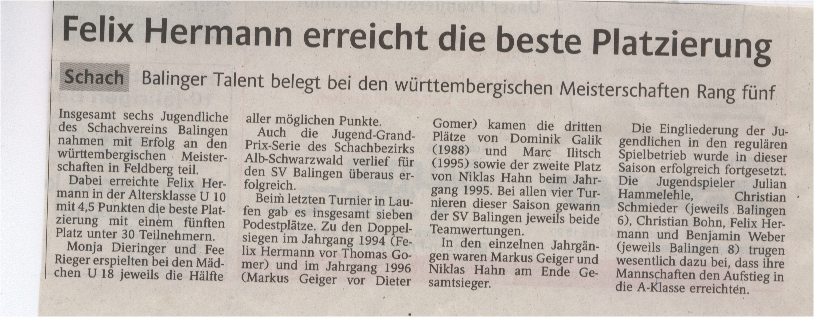Ein Jahr später nahm Alexander Schäfer als Bezirksmeister der U14 an den württembergischen Meisterschaften in Bad Urach teil. Seit 2001 gab es in jedem Jahr mindestens zwei Vertreter aus Balingen. Vor allem unsere Mädchen ergriffen gerne die Gelegenheit, eine Woche der Osterferien außer Haus zu verbringen. Da die Anzahl der jungen Spielerinnen schon immer überschaubar war, erhielt man für die Mädchenturniere auch leichter einen Freiplatz. Monja Dieringer, Fee Rieger und Lilli Hahn vertraten den Schachverein Balingen jeweils vier Mal auf Landesebene. Das Schuljahr 2006/ 2007 verbrachte Lilli mit Bruder und Mutter in England. Dennoch sicherte sie sich per Internet einen Freiplatz für das Turnier in Bonndorf und bescherte dadurch dem SV Balingen die beste Platzierung : Im Feld der U14w erkämpfte sich Lilli 5,5 Punkte und kam damit auf einen sensationellen 2. Platz. Für den größten Erfolg bei unseren jungen Herren zeichnete Felix Hermann verantwortlich. Bei den Meisterschaften der U10, die 2004 in der Jugendherberge auf dem Feldberg stattfanden, erreichte er den 5. Platz unter 30 Teilnehmern.