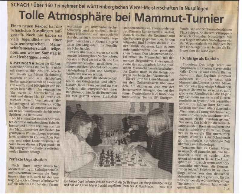 Kommen wir nun zu den Mannschaftsmeisterschaften. In diesem Bereich waren uns die Schachfreunde aus Geislingen voraus. Anfang des Jahrtausends nahmen sie regelmäßig mit einer Mädchenmannschaft an diesem Turnier teil und errangen 2001 unterstützt von Monja Dieringer als Gastspielerin den württembergischen Meistertitel. Für den SV Balingen bot sie erstmals die Möglichkeit zur Teilnahme, als die Meisterschaften 2003 in unserem Bezirk in Nusplingen durchgeführt wurden.