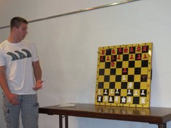 Danach konnten die jungen Schachspieler ihr soeben erworbenes Wissen einem Praxistest unterziehen. Markus spielte gegen alle Teilnehmer simultan neun schottische Partien. Die Jugendlichen zeigten sich sehr angetan davon, dass erstmals ein Vortragender zu ihnen sprach, den sie alle aus dem Jugendschach kannten. Und mit Hagen Martin und Paul Claußen gelang sogar zwei von ihnen einen Sieg über den "großen Meister".