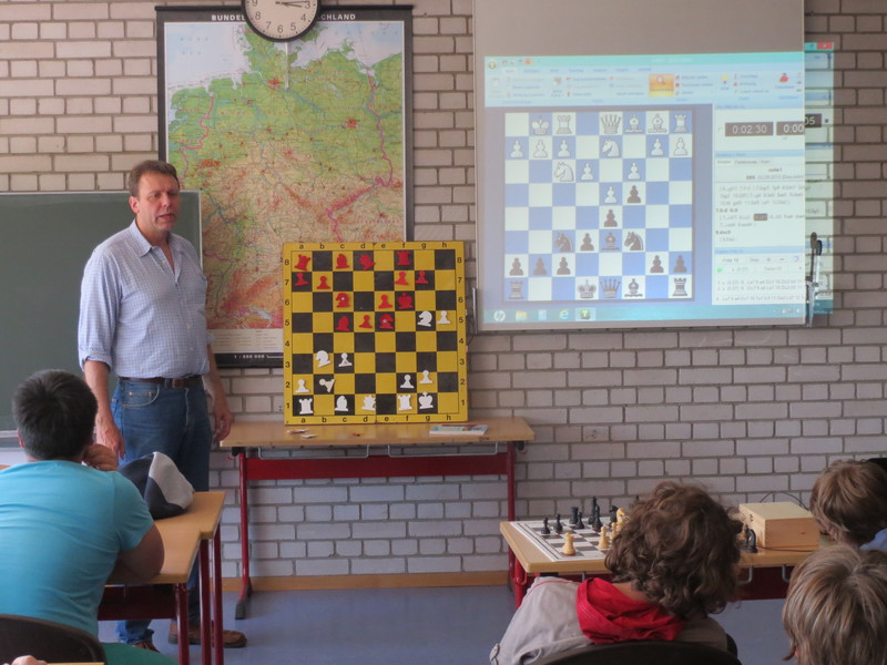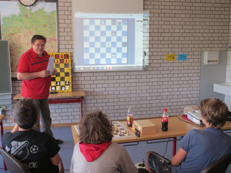Anhand von einigen märchenhaften Kurzpartien demonstrierte Dr. Windrich wieder einmal überaus unterhaltsam, worin die Essenz des Schachspiels besteht, und seine jungen Zuhörer folgten seinen Ausführungen fasziniert.